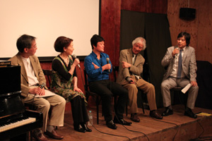 前夜祭の様子(左手から、司会の石井彰さん、宮本信子さん、本多俊之さん、塩屋久夫さんカメラマン、阿武野勝彦監督)